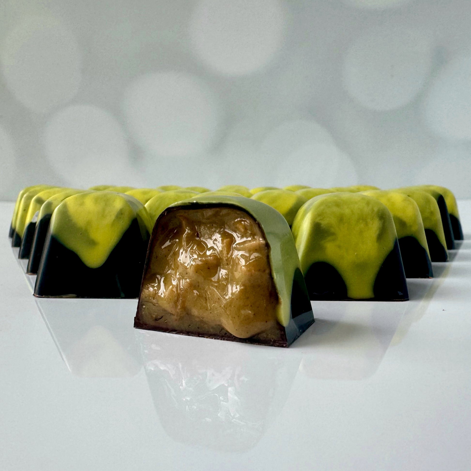 Our take of the Dubai internet sensation features two layers of outrageous pistachio in a dark chocolate shell... Gooey pistachio cream studded with bits of butter-fried kataifi pastry is sitting on a sinfully rich pistachio ganache.